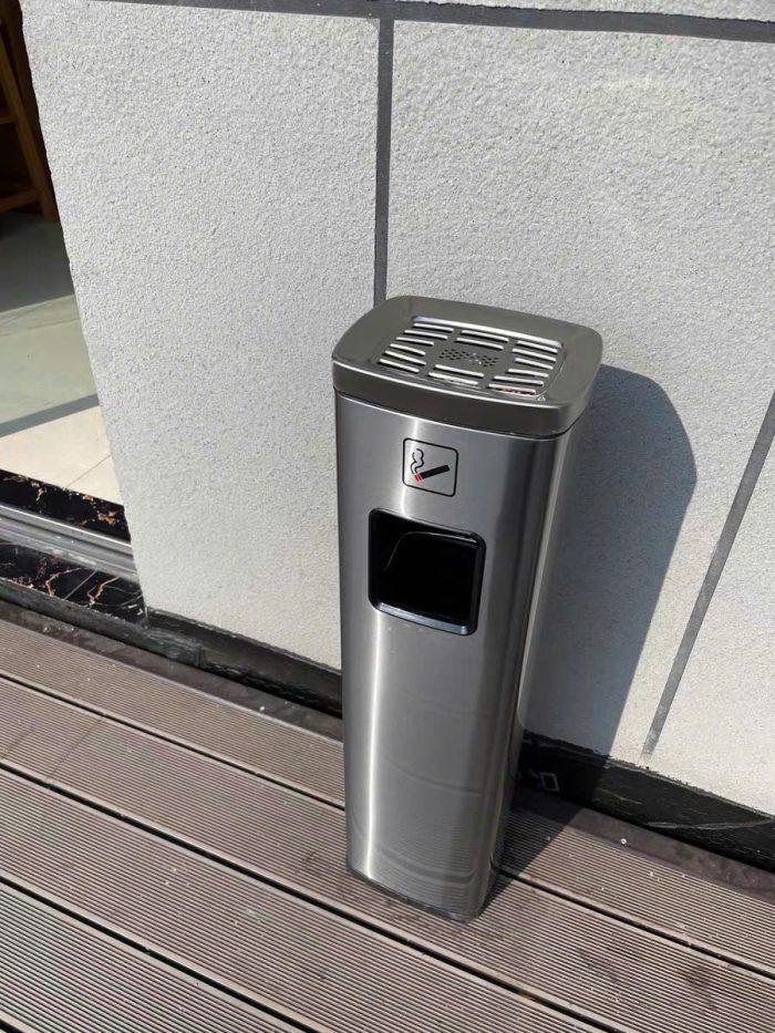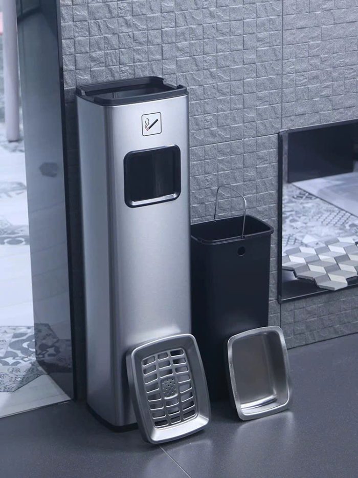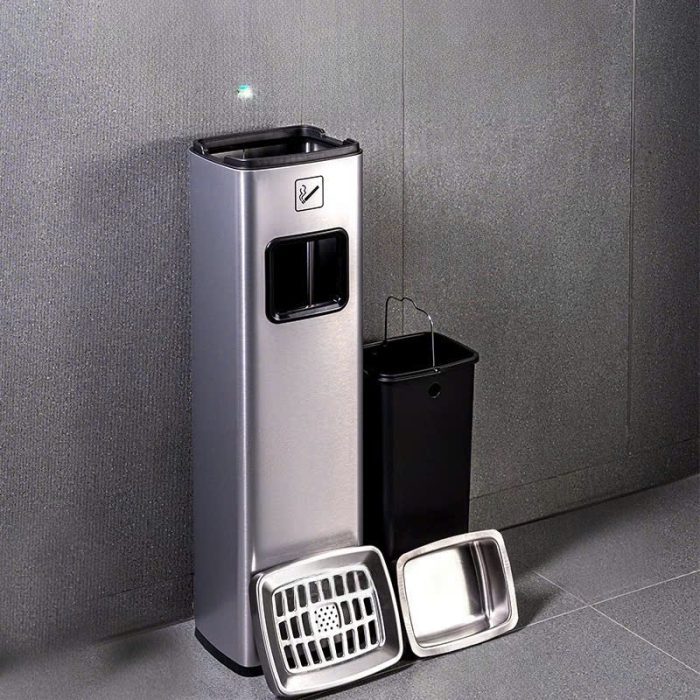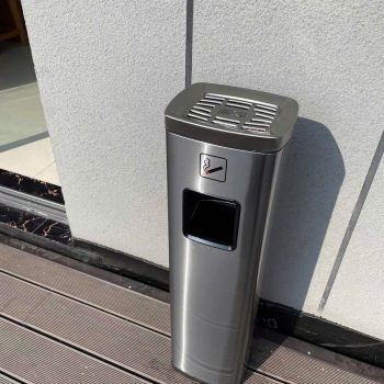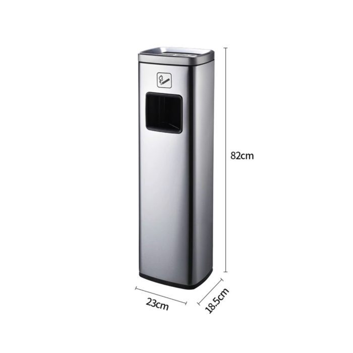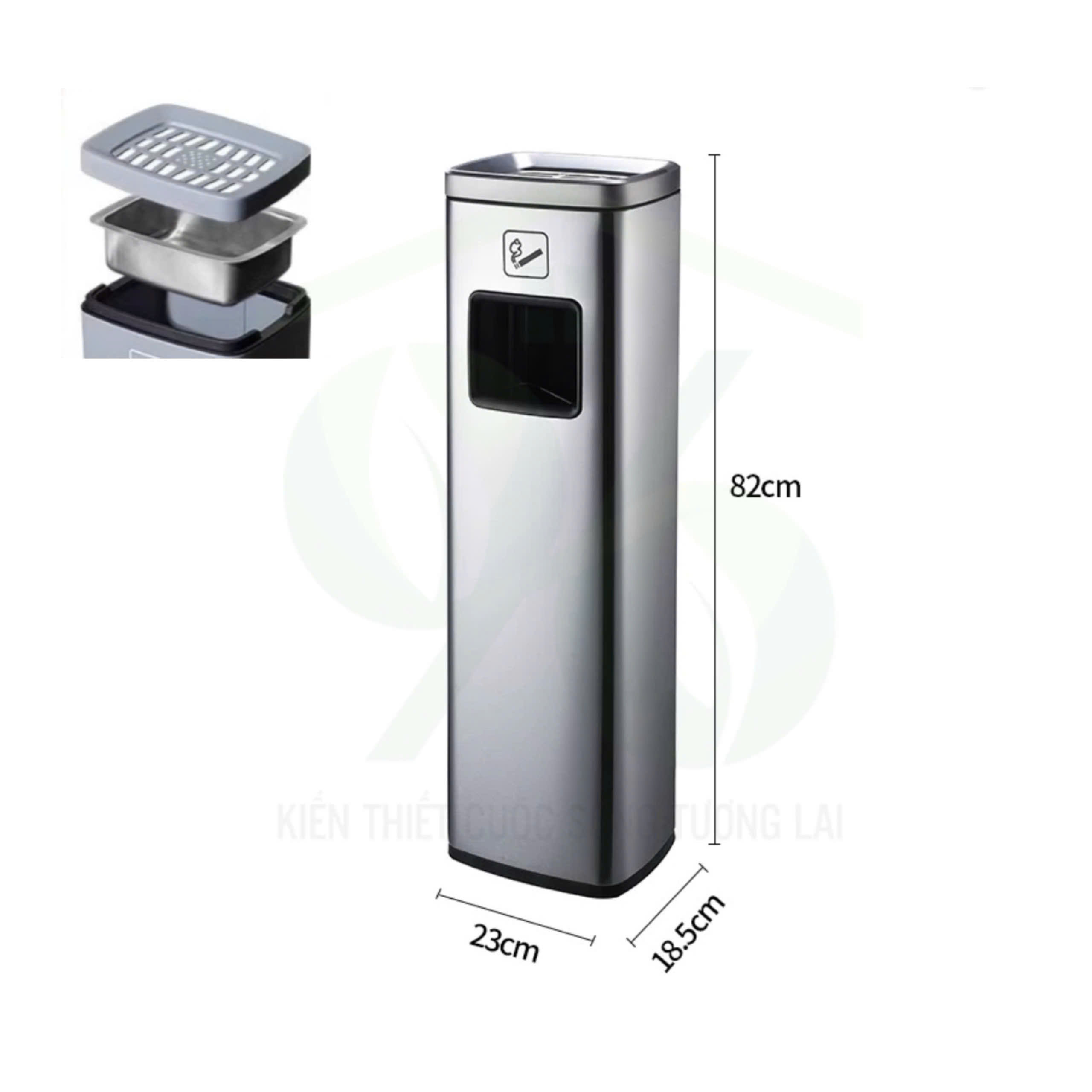 Thùng rác inox vuông có gạt tàn thuốc, lưới chống xả rác trên gạt tàn và có cửa xả rác phía trước thuận tiện cho việc xả rác