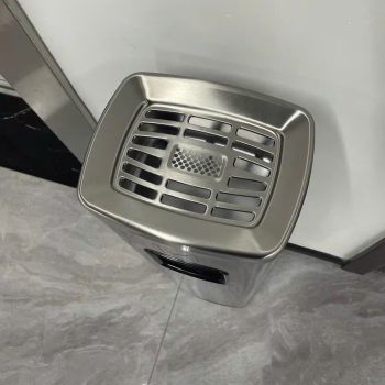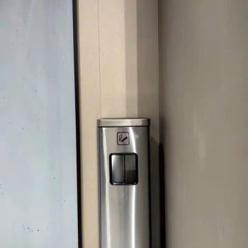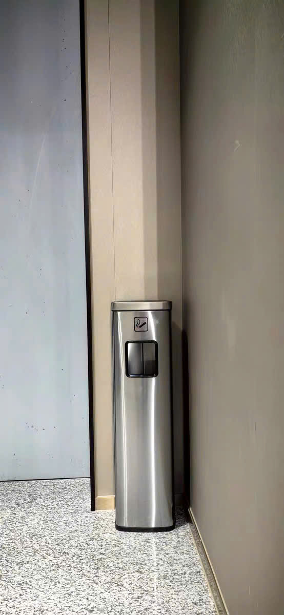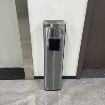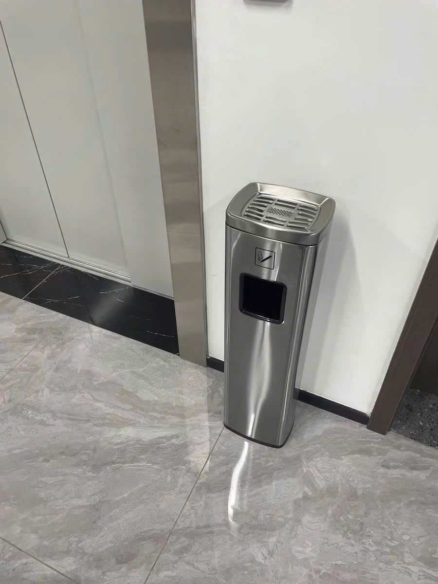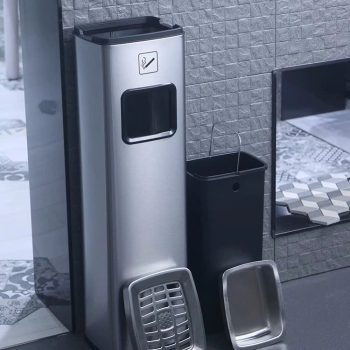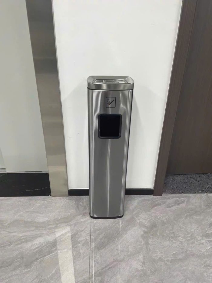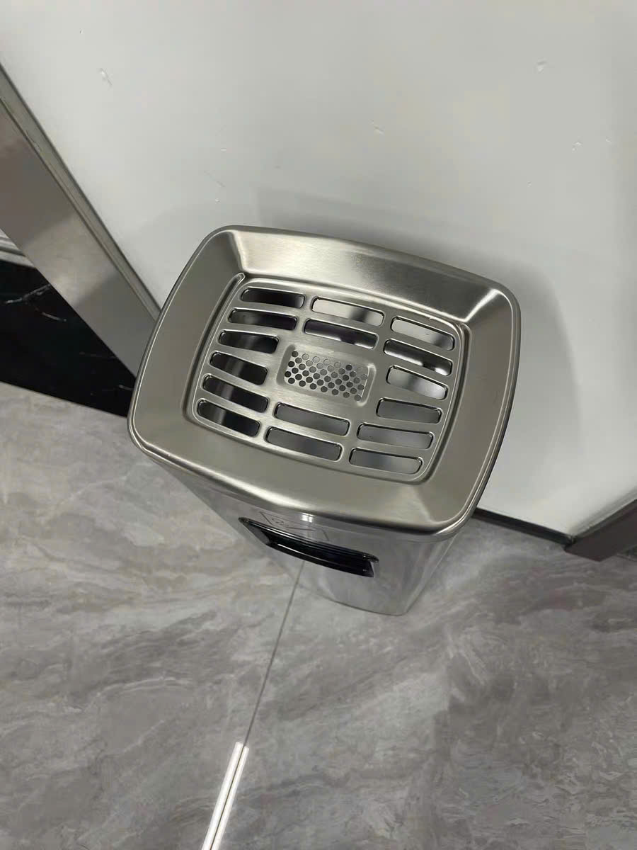 Thùng rác inox vuông có gạt tàn thuốc, lưới chống xả rác trên gạt tàn và có cửa xả rác phía trước thuận tiện cho việc xả rác