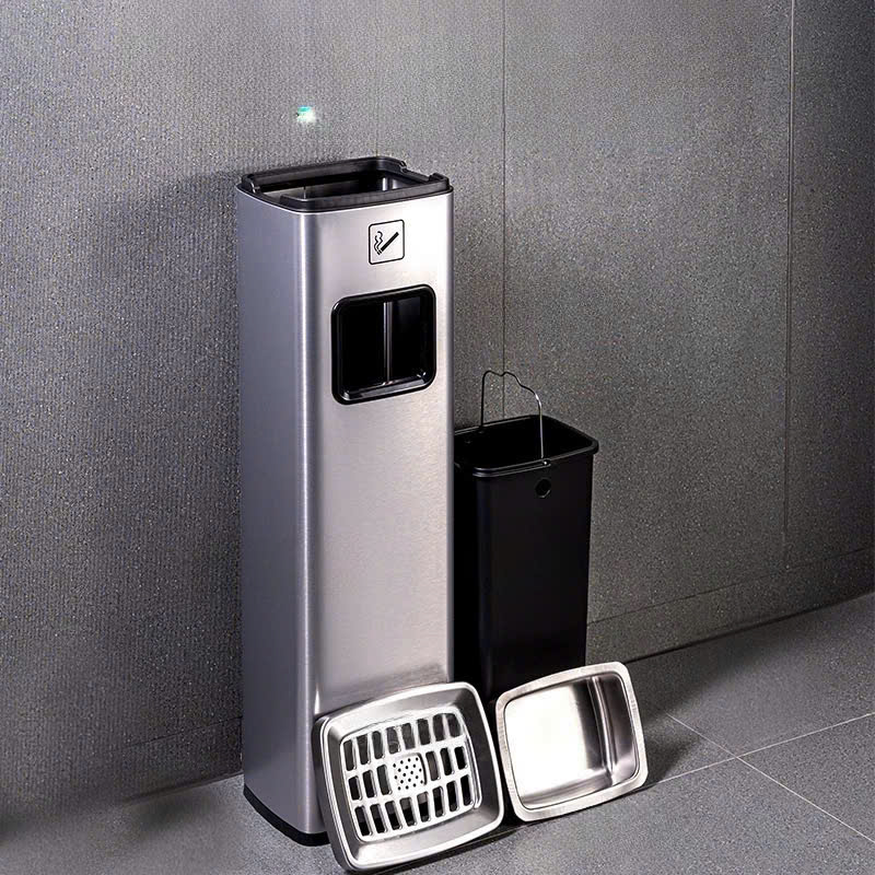 Thùng rác inox vuông có gạt tàn được làm từ chất liệu inox nhập khẩu có khả năng chống oxy hóa ăn mòn, rỉ sét, sang trọng, sạch sẽ, độ bền cao.