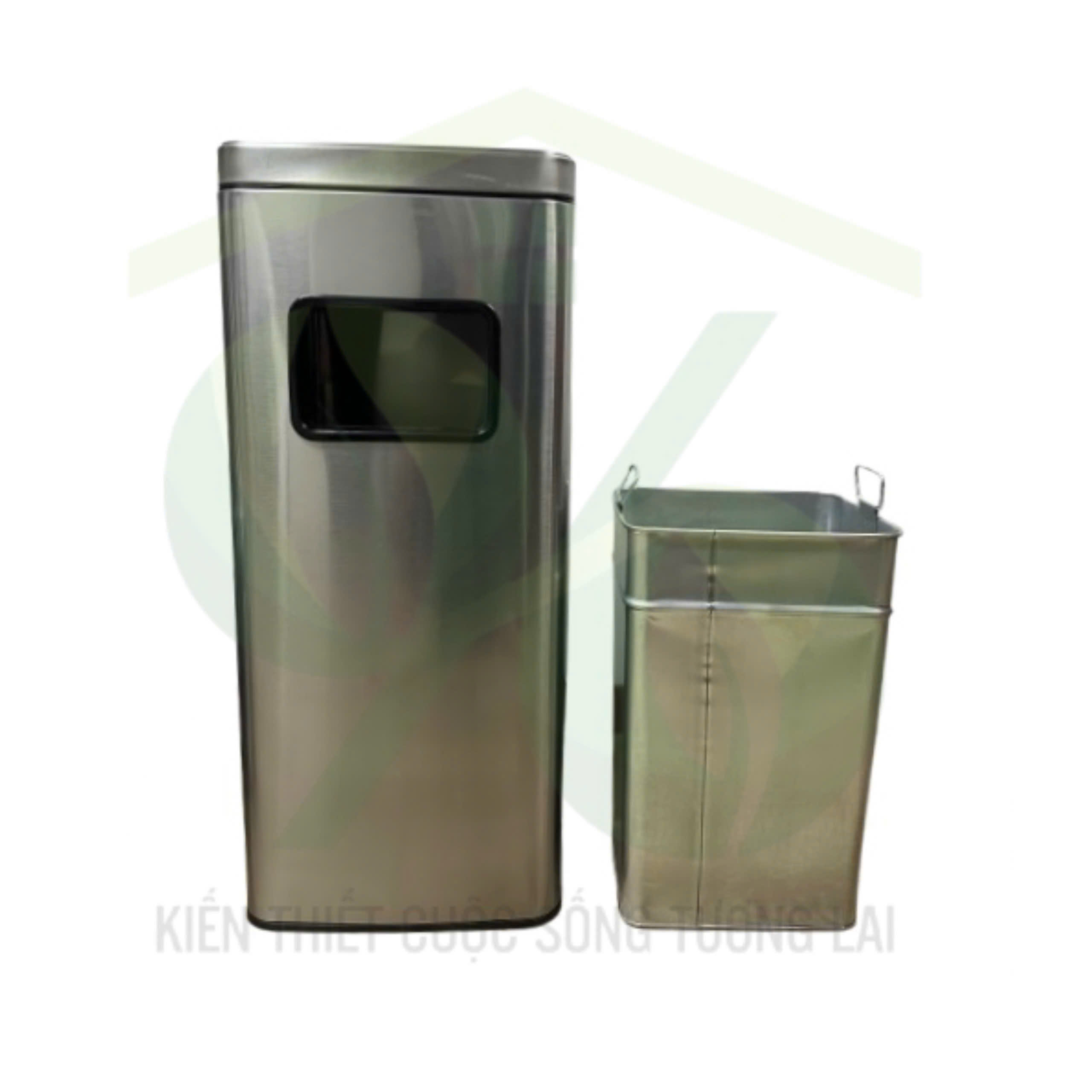 Thùng rác inox vuông có gạt tàn thuốc, lưới chống xả rác trên gạt tàn và có cửa xả rác phía trước thuận tiện cho việc xả rác