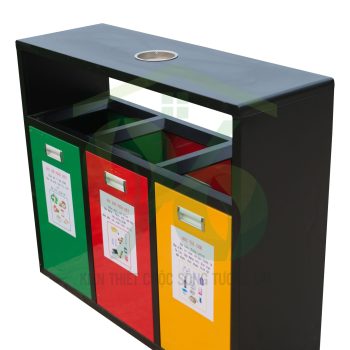 Thùng rác thép 03 ngăn ngoài trời được thiết kế 3 ngăn có tác dụng phân loại rác vô cơ, hữu cơ và tái chế thông qua ký hiệu in trên thùng.