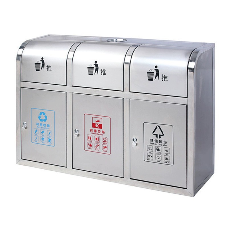 Thùng rác inox 03 ngăn ngoài trời có gạt tàn mái phẳng được thiết kế 3 ngăn có tác dụng phân loại rác, có 2 lỗ kèm ngăn chứa gạt tàn thuốc thông qua ký hiệu in trên thùng.