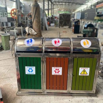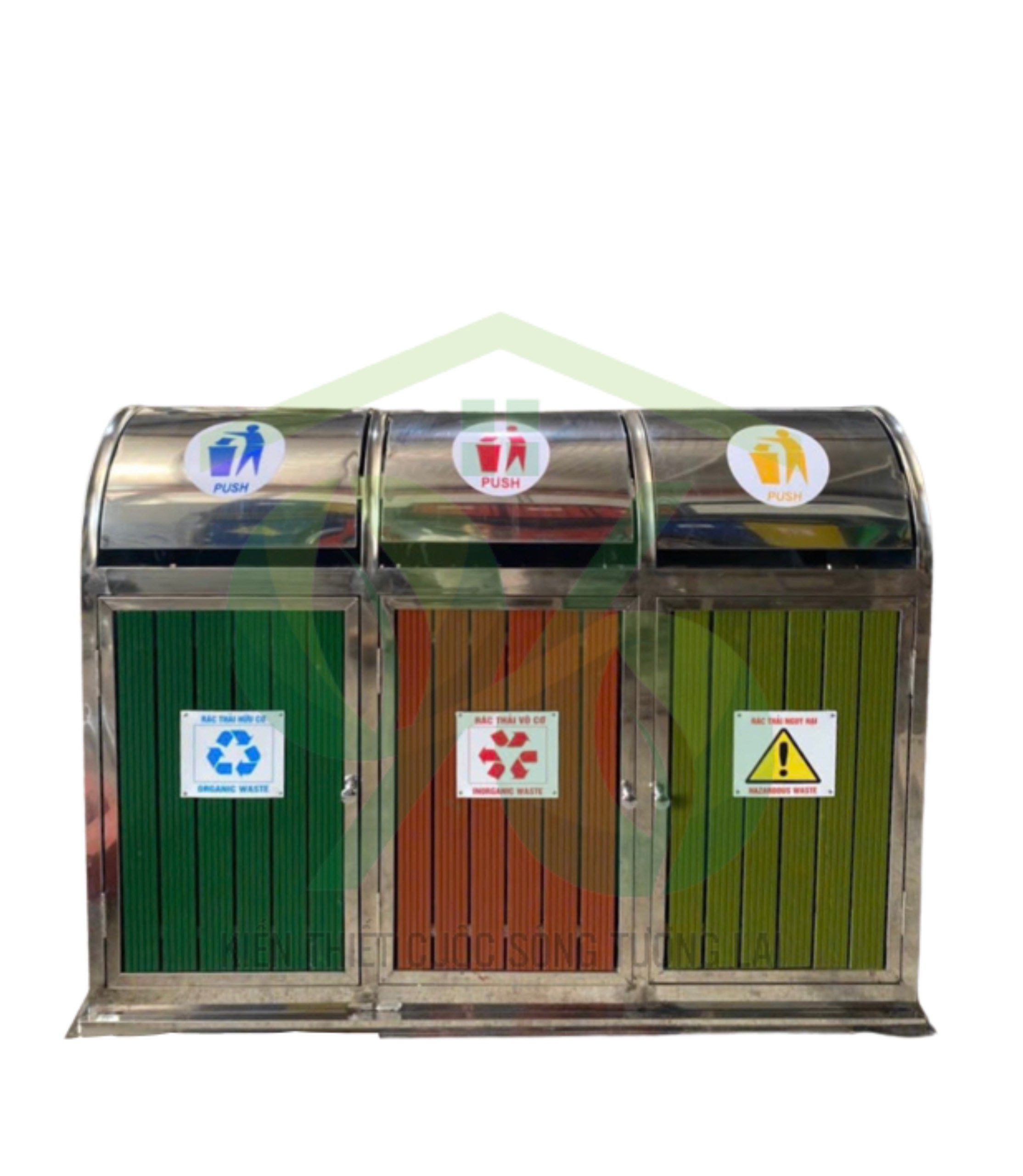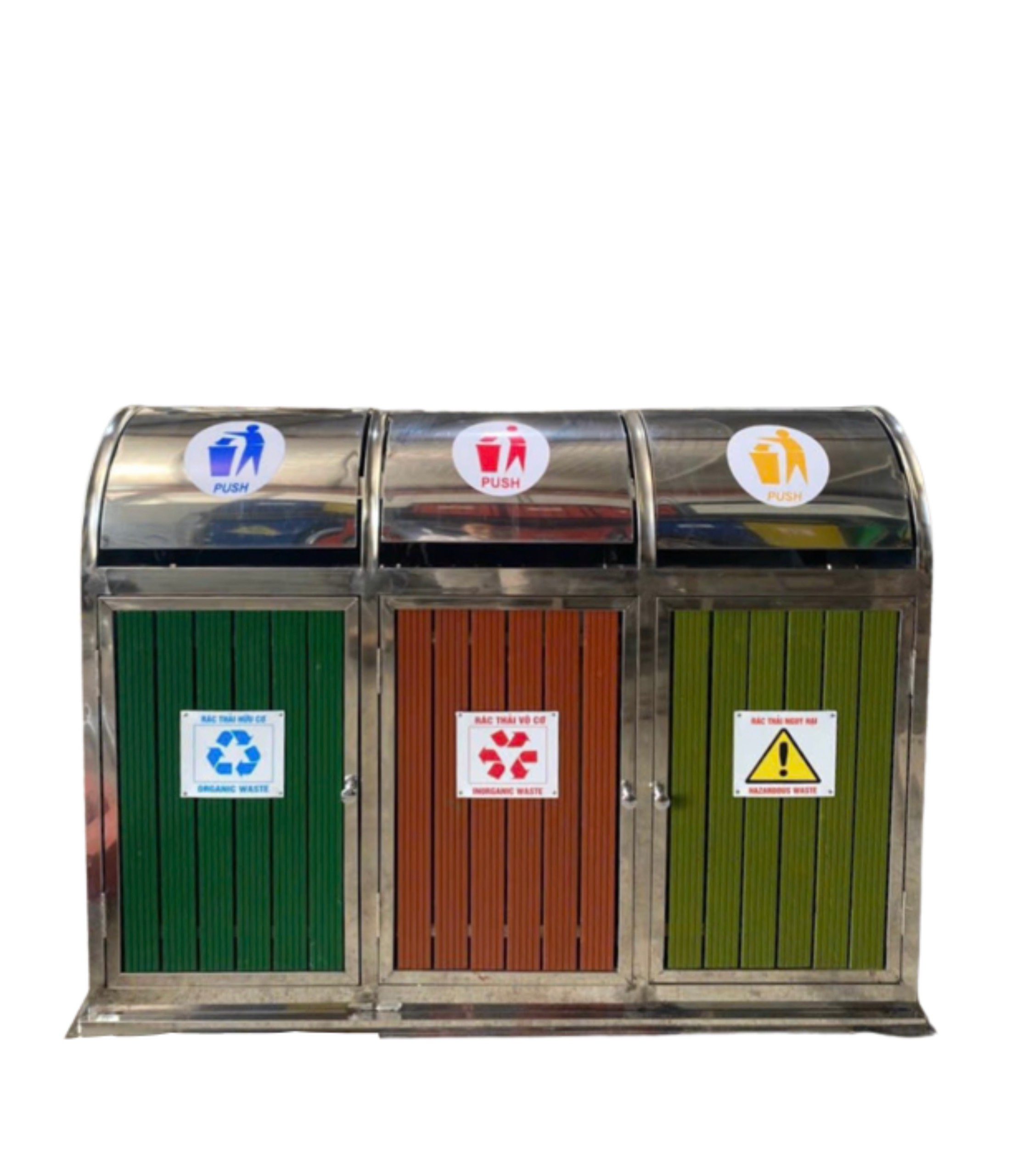 Thùng rác inox 03 ngăn ngoài trời được thiết kế 3 ngăn có tác dụng phân loại rác vô cơ, hữu cơ và tái chế thông qua ký hiệu in trên thùng.