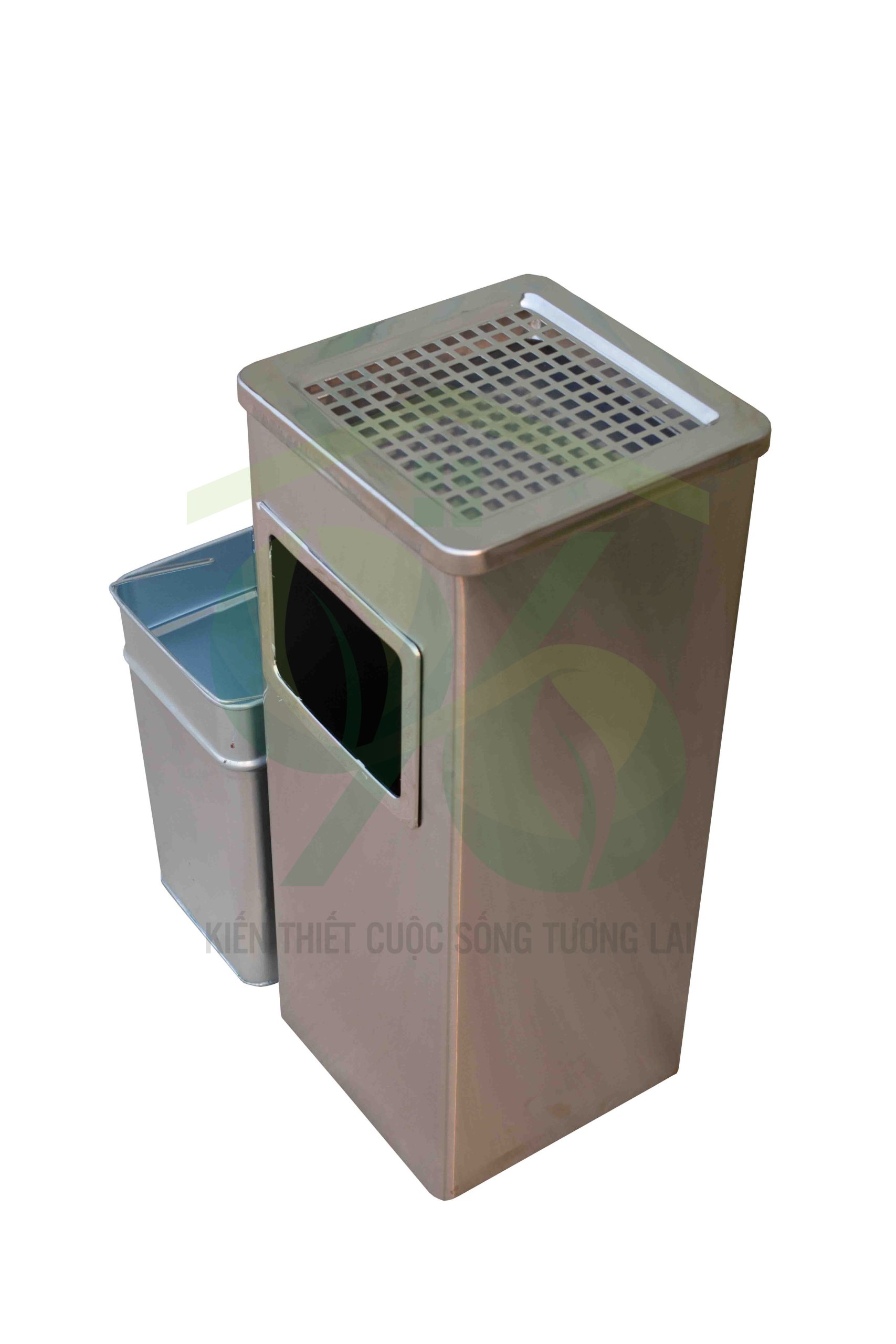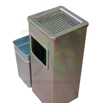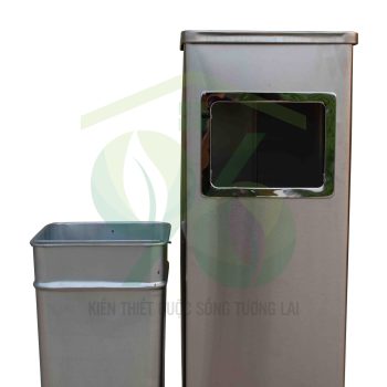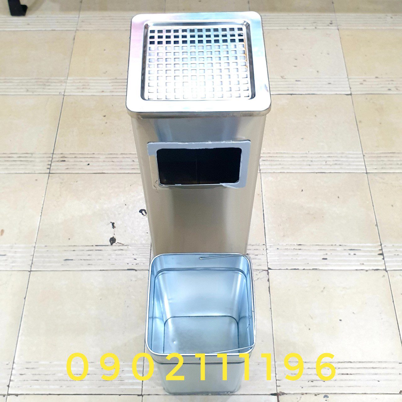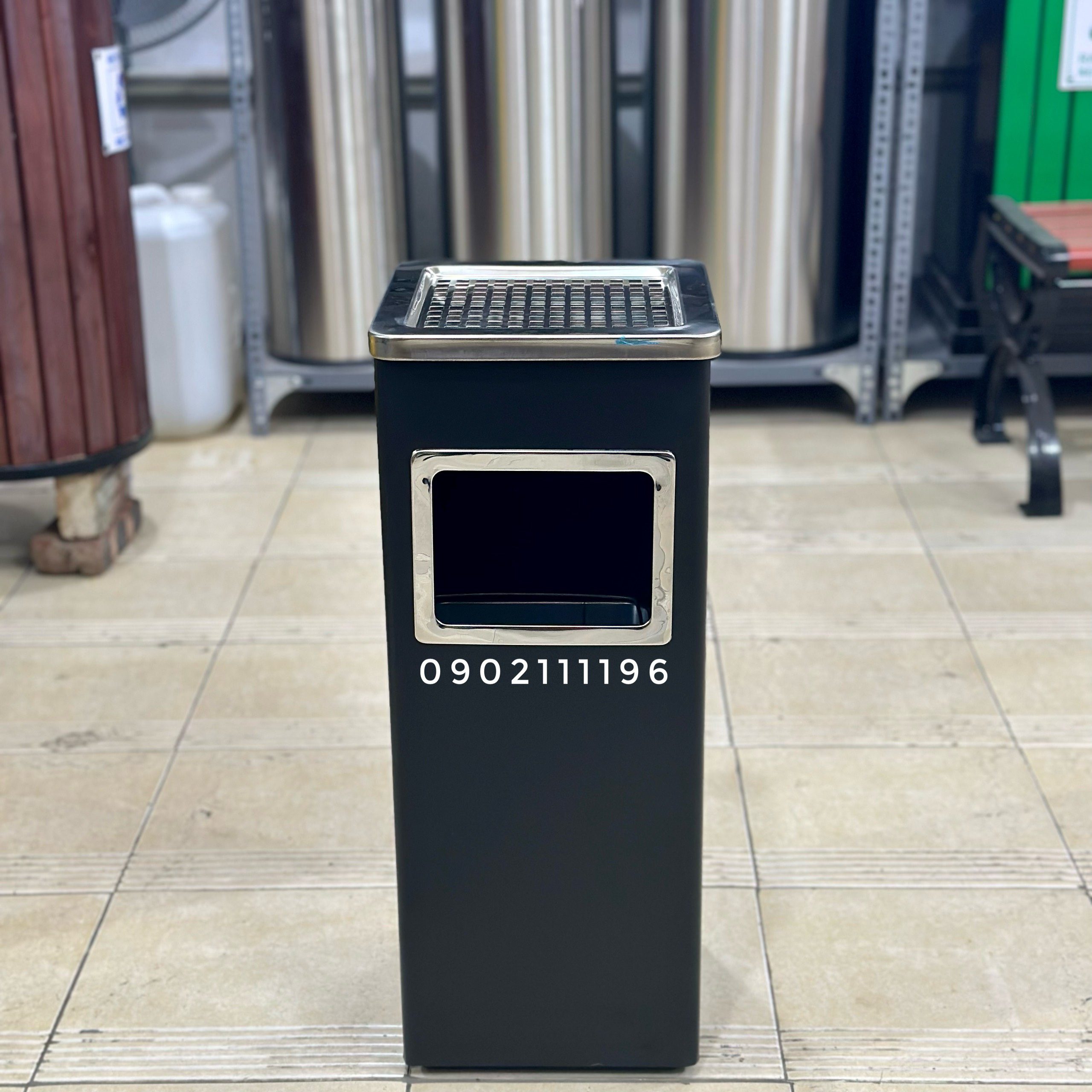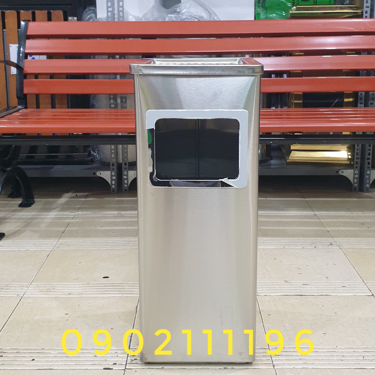 Thùng rác inox vuông có gạt tàn thuốc, lưới chống xả rác trên gạt tàn và có cửa xả rác phía trước thuận tiện cho việc xả rác