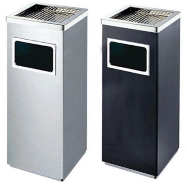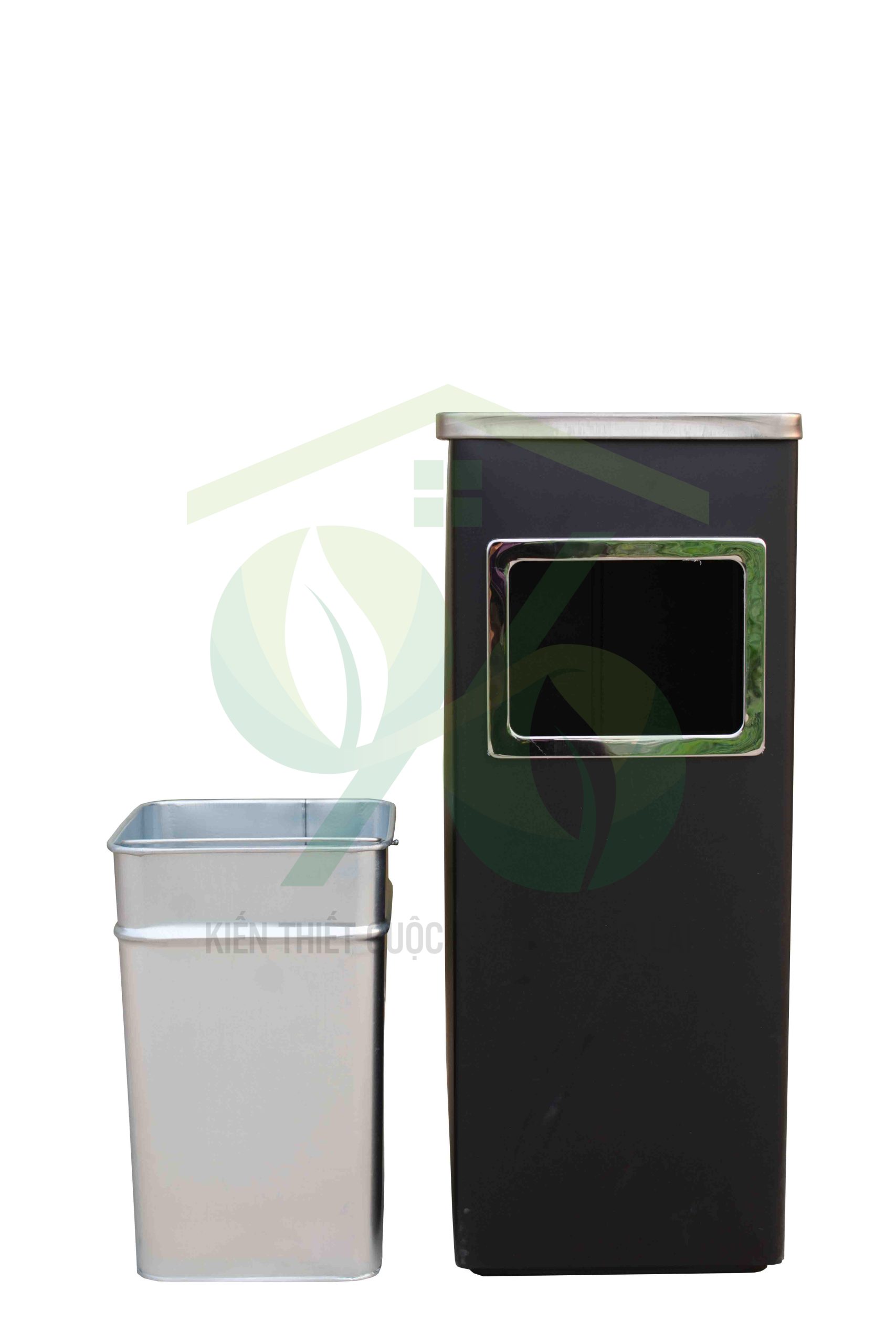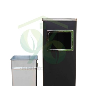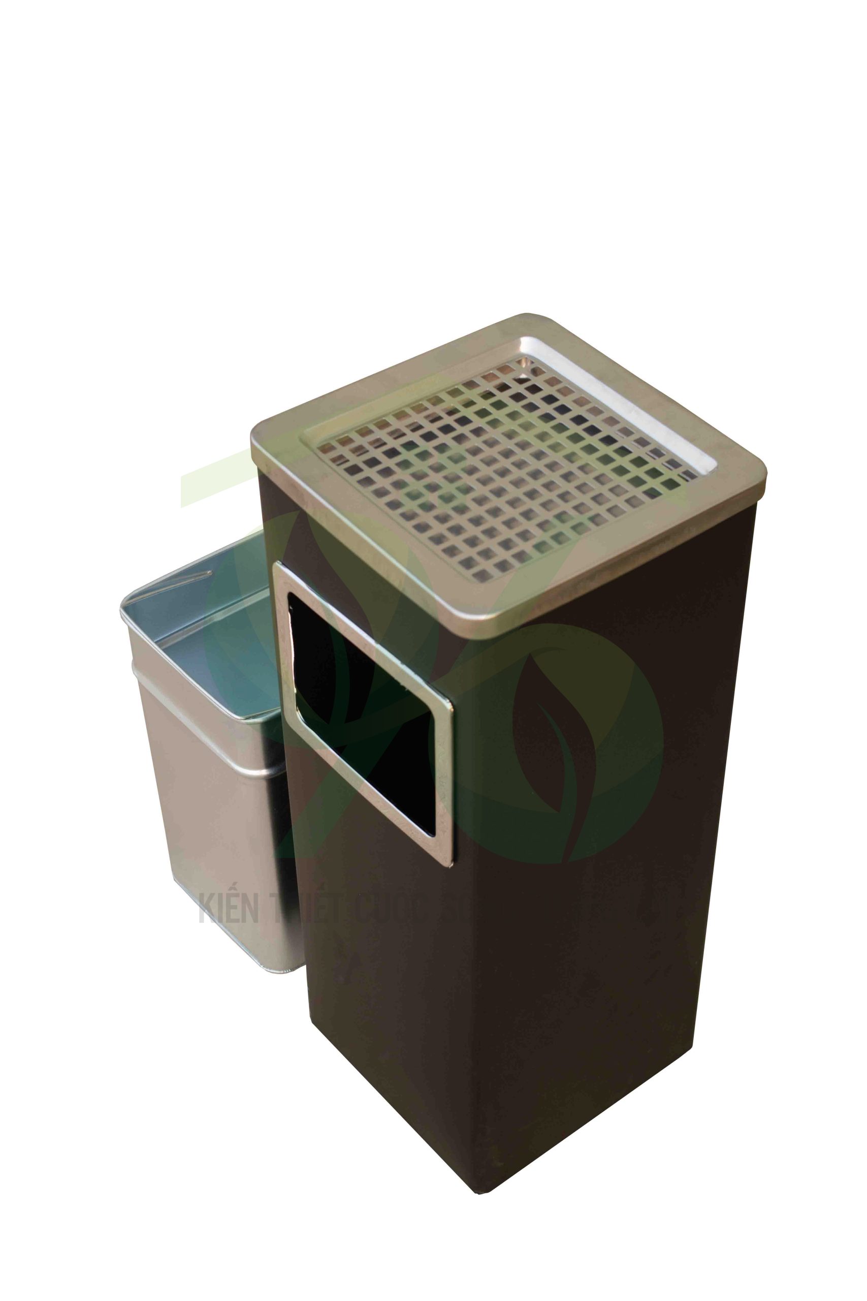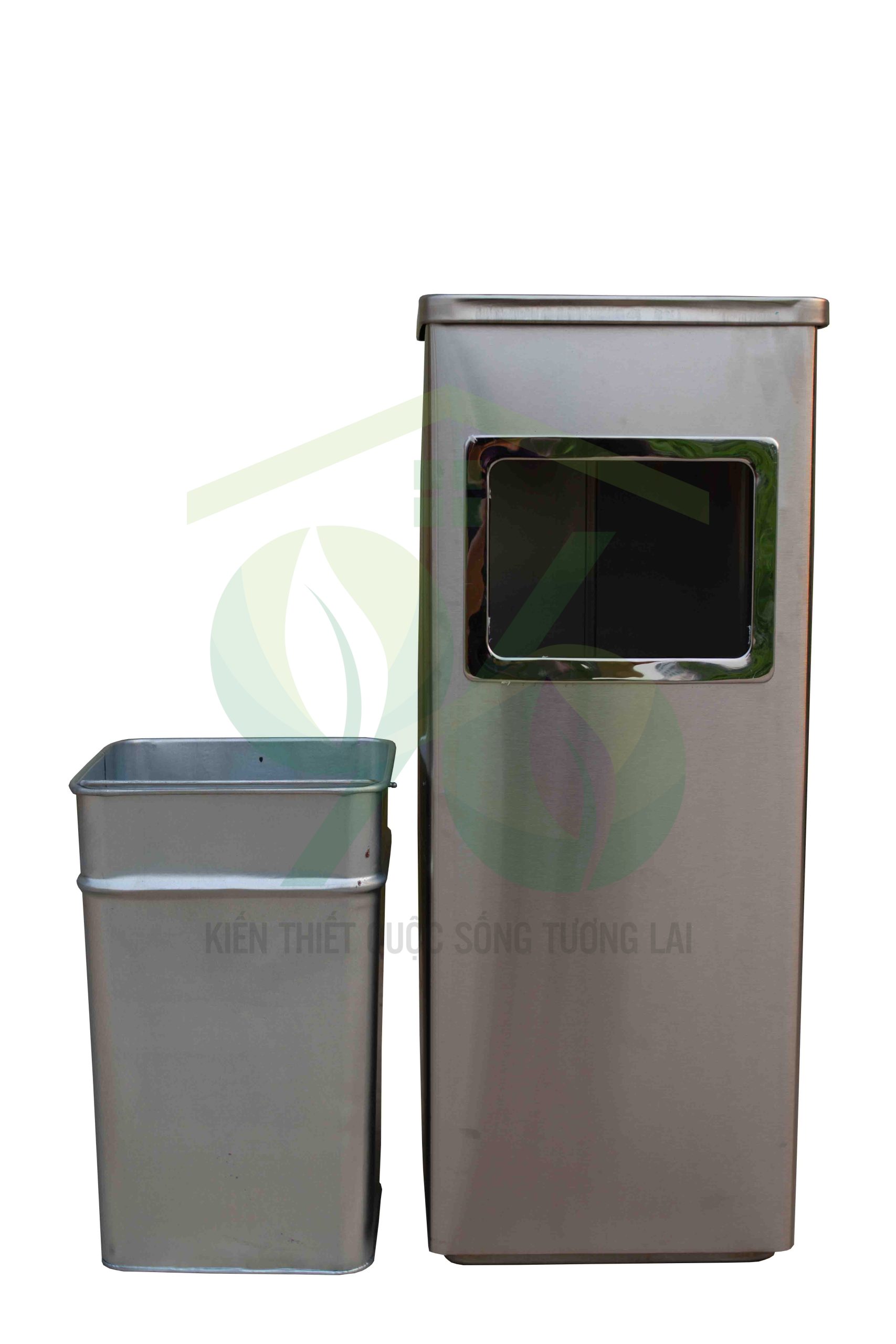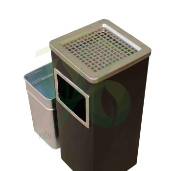 Thùng rác inox vuông có gạt tàn thuốc, lưới chống xả rác trên gạt tàn và có cửa xả rác phía trước thuận tiện cho việc xả rác
