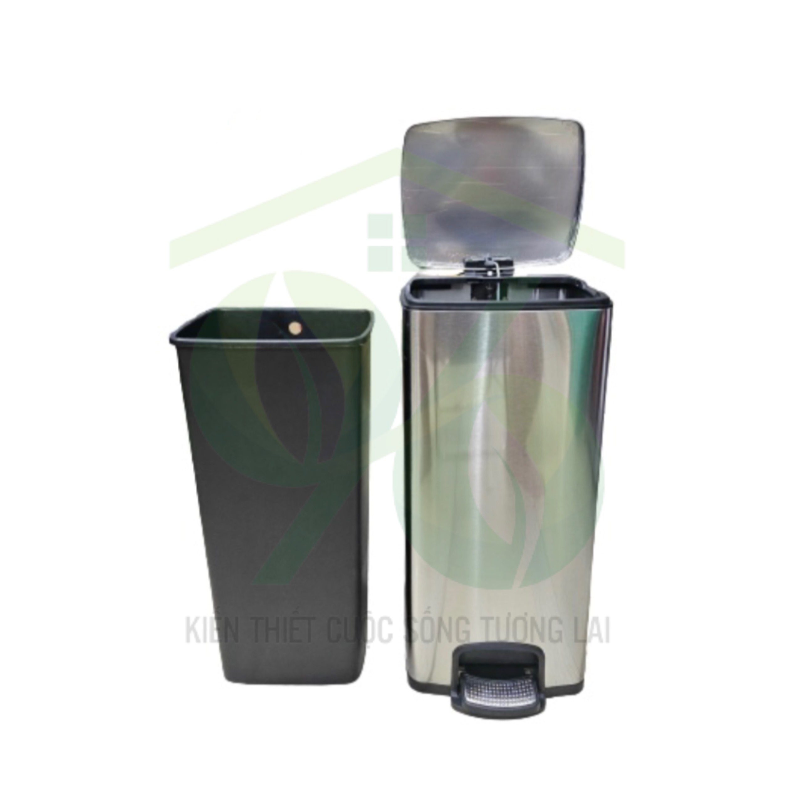 Thùng dạng hình chữ nhật vuông, nắp thùng rác dạng đạp chân (pedal) nên chỉ cần đạp nhẹ là mở nắp
