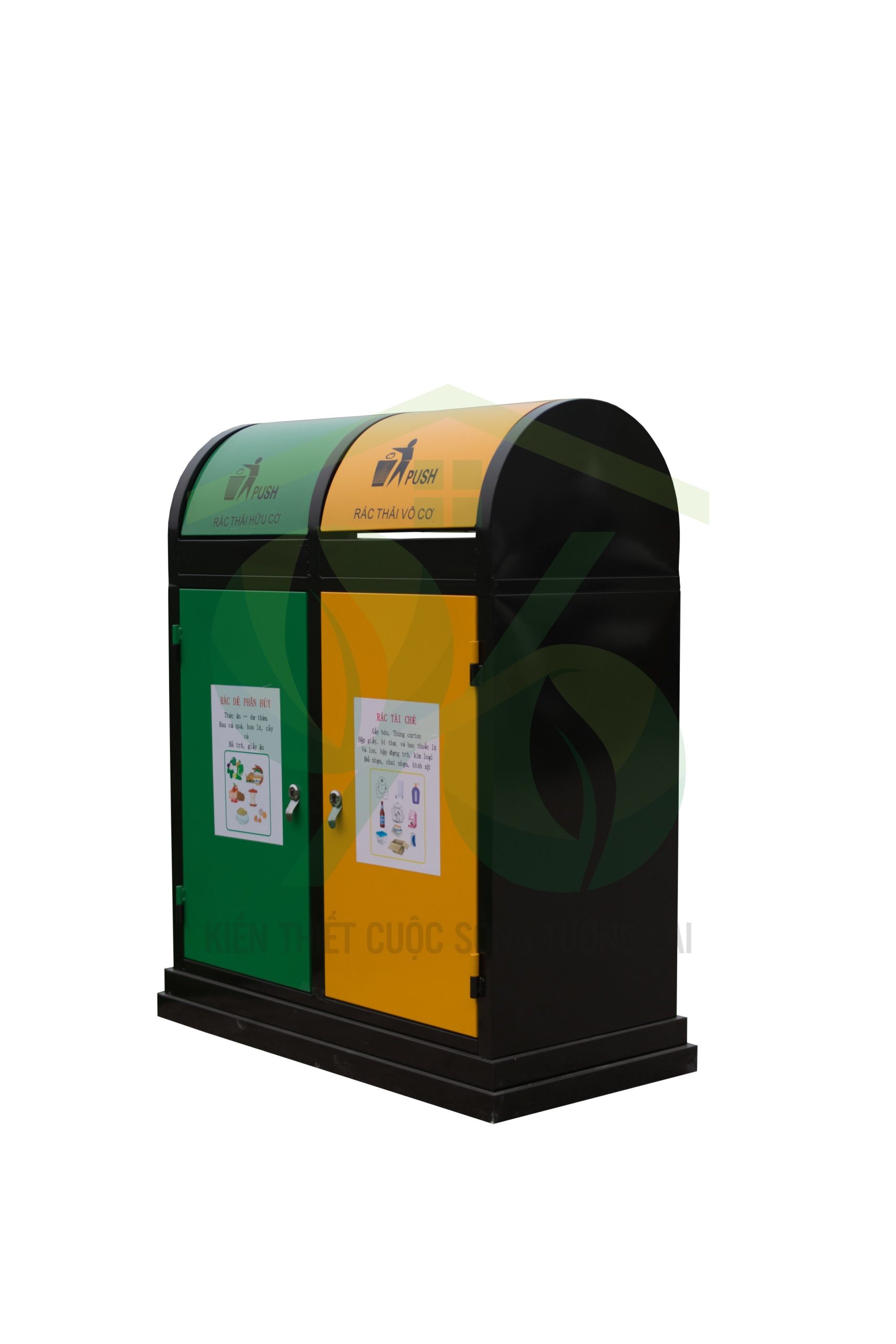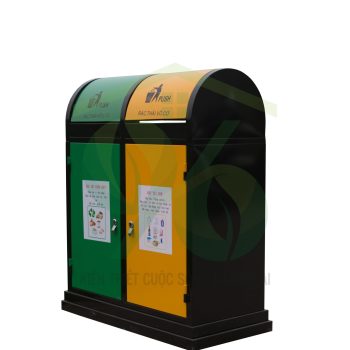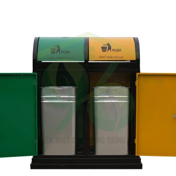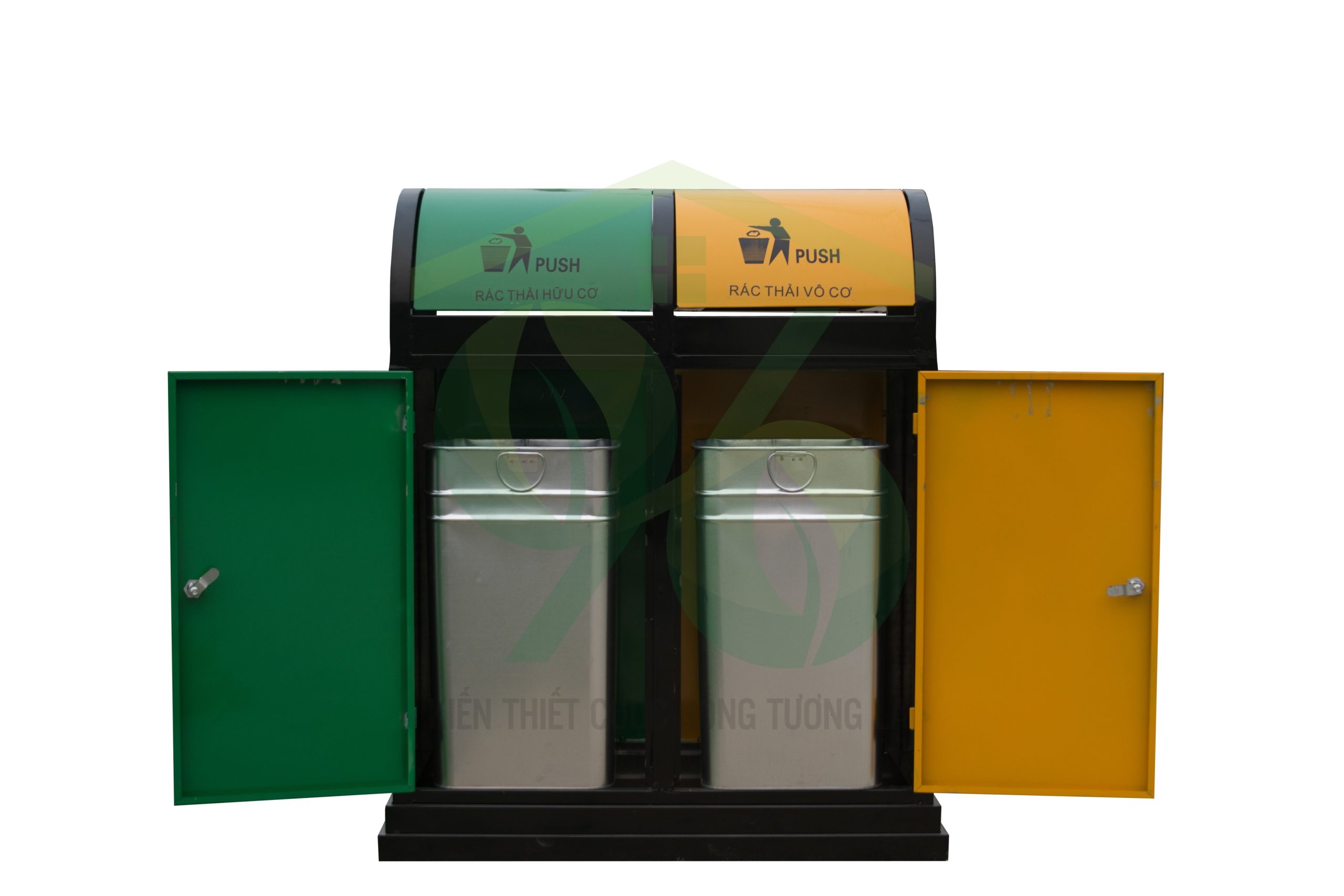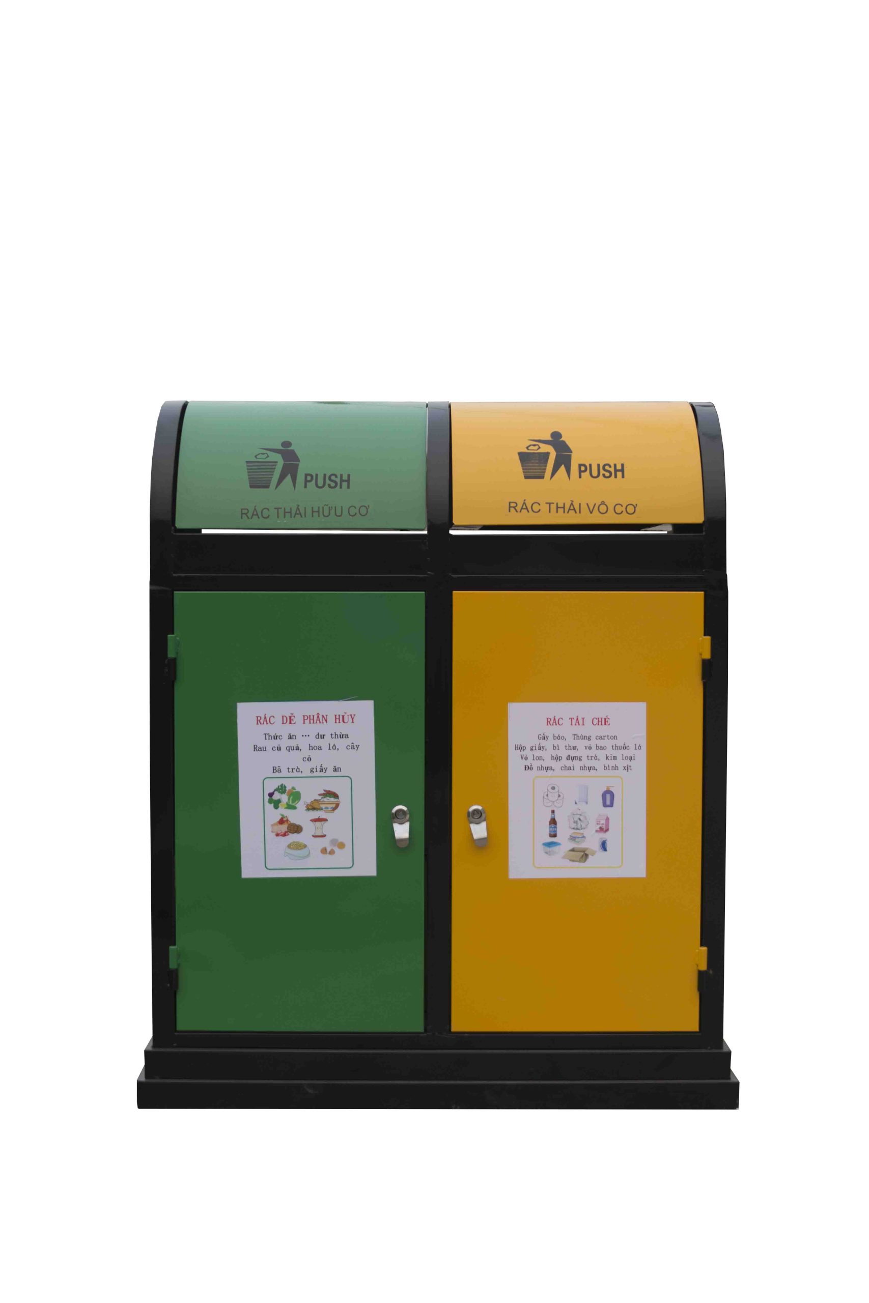 Thùng rác thép 02 ngăn ngoài trời được thiết kế 2 ngăn có tác dụng phân loại rác vô cơ và hữu cơ thông qua ký hiệu in trên thùng.